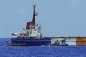 Mairead Maguire standing alongside the aid ship MV Rachel Corrie, May 12, 2010.