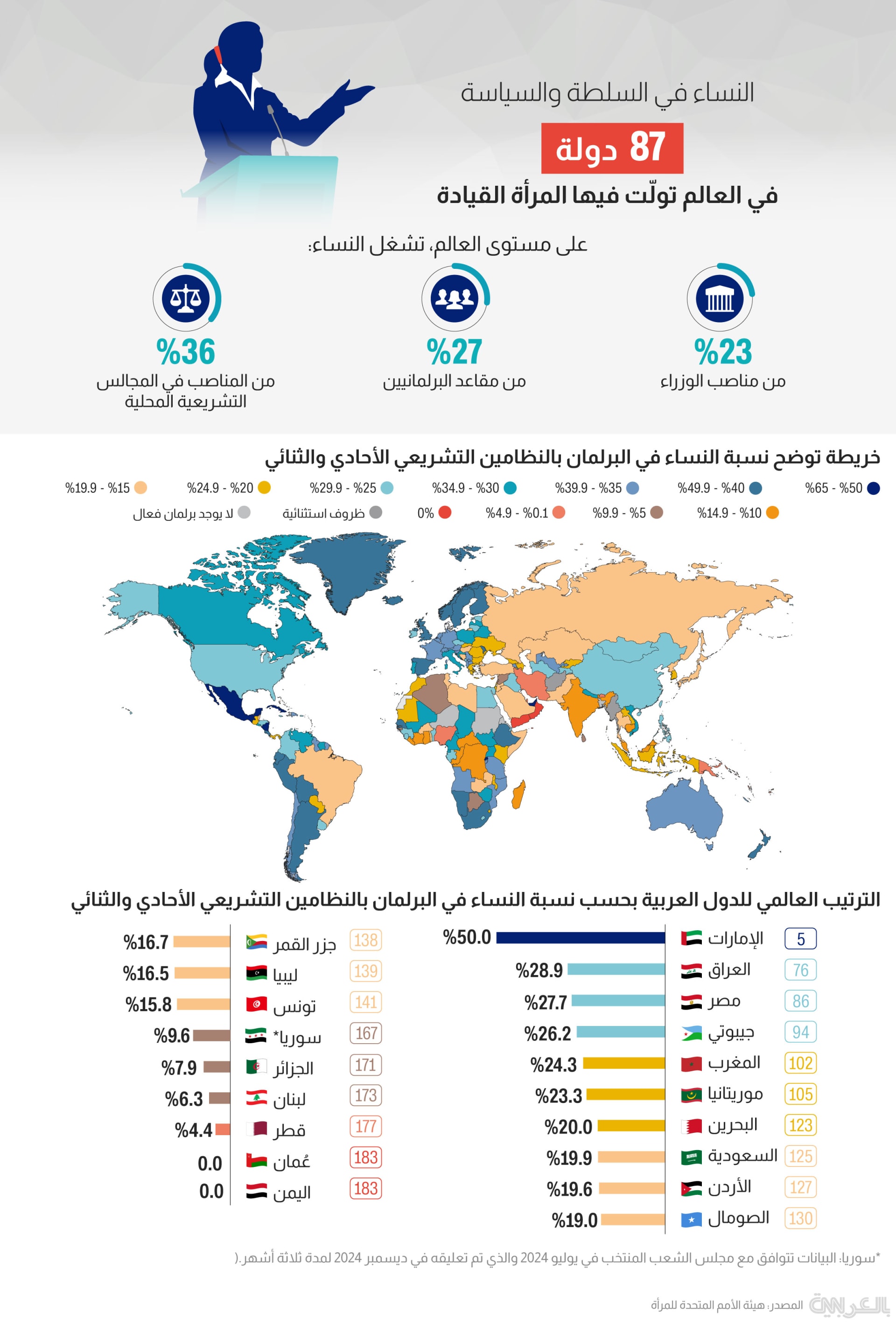 تعرّف في الإنفوغراف أعلاه إلى ترتيب الدول العربية بحسب نسبة النساء في البرلمان بالنظامين التشريعي الأحادي والثنائي